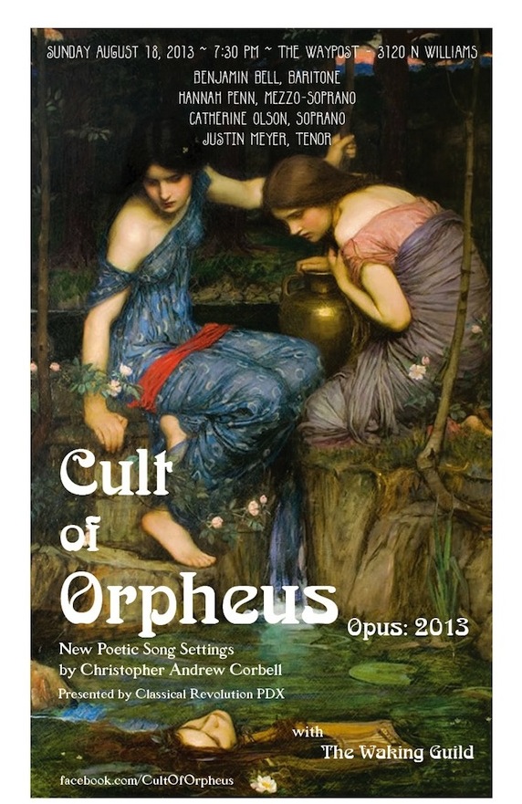 In 2013 C. A. Corbell was evolving from songwriter, bandleader, and sometimes poet, to producer of chamber music concerts while composing for various instruments and voice. Cult of Orpheus was the name he took for the effort which debuted his first composed songs — settings of texts from The Dhammapadha, from Catullus and Baudelaire and Edna St. Vincent Millay among others. The name was chosen not so much for the sake of branding as for a mystic-poetic covenant, to ensure the focus would remain on what he sensed as that rare Orphic moment/locus which makes room and time for lyrical, poetic song. That first concert, at a small pub in north Portland, fittingly ended with the composer’s setting of a poem from Rilke’s Sonnets to Orpheus.